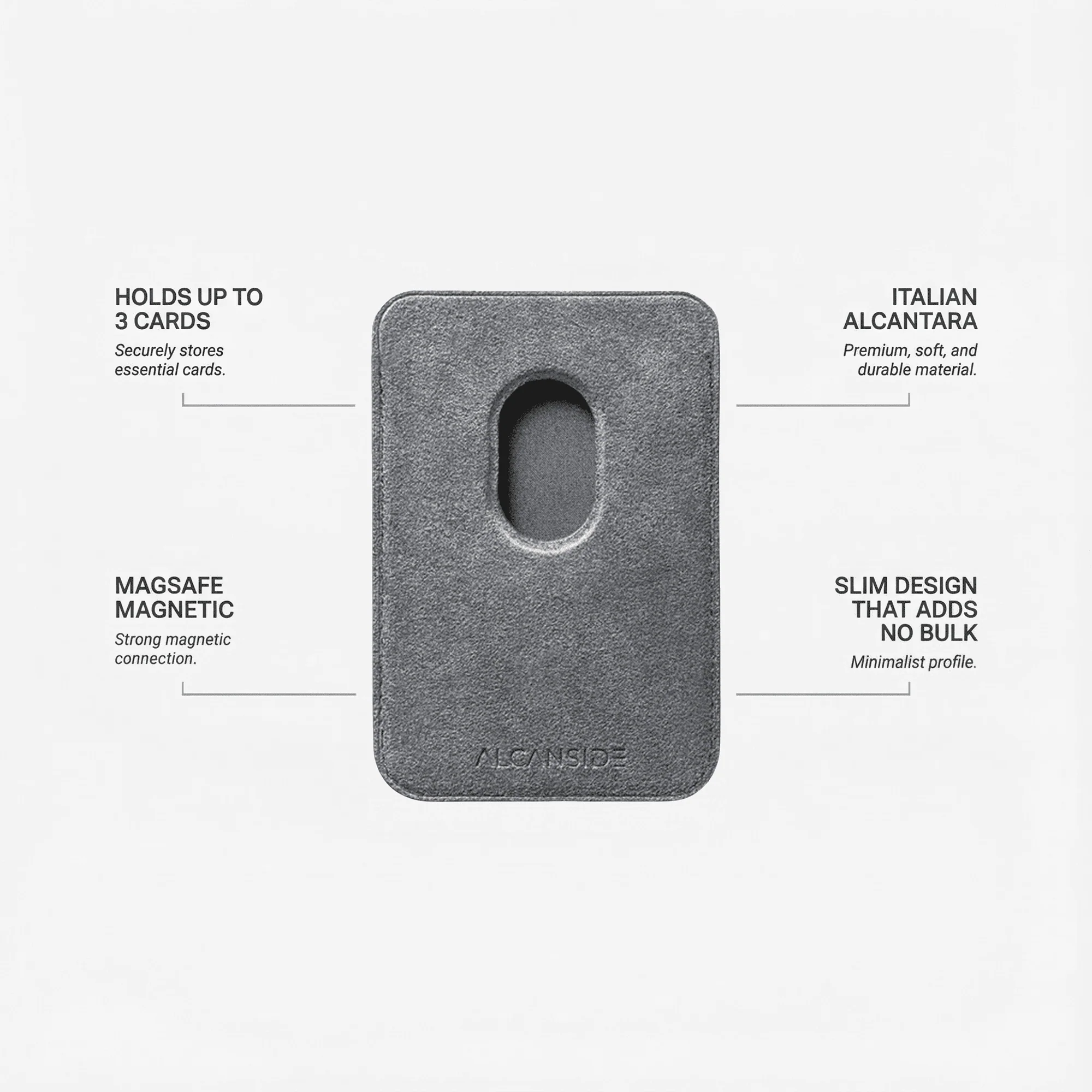 MagSafe Wallet – A sleek, magnetic wallet designed to keep your essentials close at hand without compromising on style. Engineered for convenience and crafted with precision, this minimalist wallet attaches seamlessly to your iPhone, holding up to three cards securely. Wrapped in luxurious Italian Alcantara®, it offers a refined look and soft-touch feel — perfect for those who value elegance in their everyday carry.